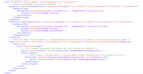 After reading through Jason's LaunchBox theming PDF I found something quite useful in the examples that use Style Triggers. You can basically build a case statement based on a SelectedGame property value (assuming it's exposed). I'm sure there's a cleaner way to assign the bindings than what i show below, since i just copied that from an existing startup theme: