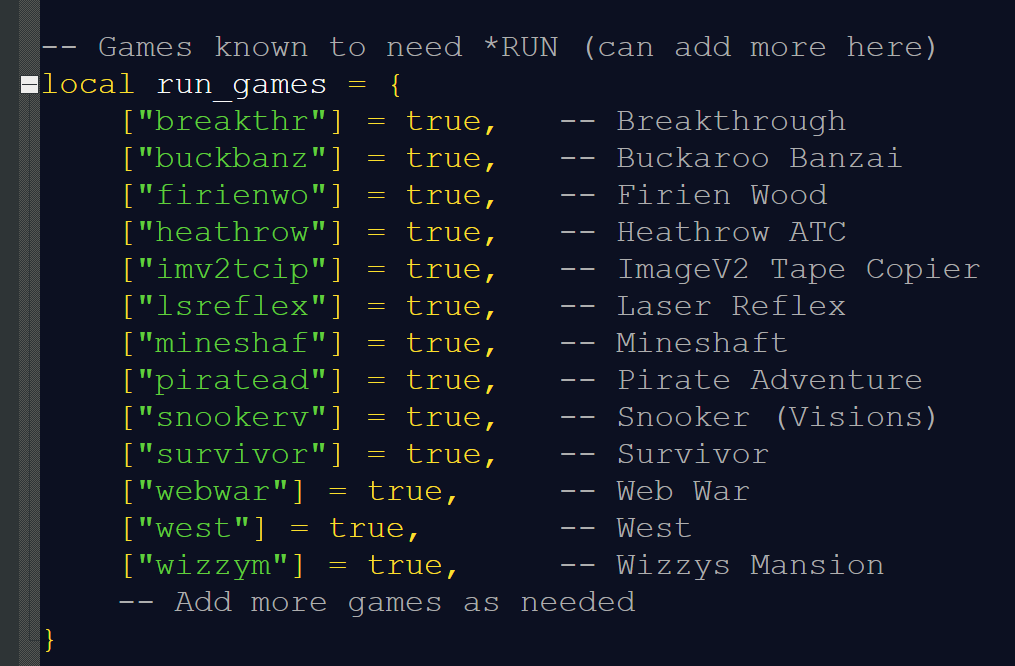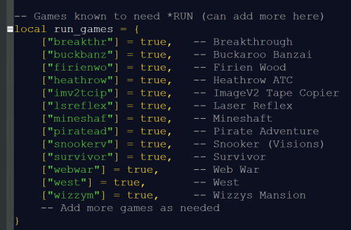 Exception list: *RUN then CHAIN"" A handful of games are hardcoded in the run_games table to use *RUN first, then CHAIN"". These are games that are known to need it. The *RUN call essentially executes a binary/executable file from tape before the CHAIN command chains into the game properly.