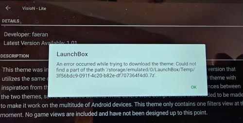 Hi all, after a fresh install, I can´t install themes anymore. First I uninstalled Launchbox and then deleted the LB folder. Install it again, applied License and tried to install a theme, no success, it doesn´t matter which one, I receive the following error: Is it something still saved on my android after I deleted the LB folder?