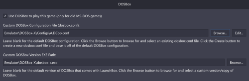Hi All, EDIT: Please see bottom for original message New message I have found two work arounds, not sure if it is a bug or a user specific issue. I have used custom fields on certain DosBox-X/DosBox emulated games When I arrange/sort the games by one of these custom fields, LaunchBox ignores the custom DosBox exe request, but when I sort by Title or anything else it works. Simple option is just leave in title and normally they are but it wasn't earlier and that's what caused the issue, I had been doing some work on tidying things up/improving my theme and had left sorted by Controller type. Why would LaunchBox ignore the custom exe but only when sorted by a custom field that has a value in it? Thanks for any help. Original message; I thought I would play a game today, but unfortunately LaunchBox appears to be ignoring the custom Dosbox Version path. Rather than using Dosbox-X it is loading DosBox 0.74 from the third party folder. I know it use to work, so not sure what has changed. I have tested several other games and they are all doing the same DosBox-X is 06/10/23 and LaunchBox is 13.8 Anyone else having an issues or can any see where I'm going wrong? The conf works for loading directly in DosBox-X Its just LaunchBox ignores my request to use DoxBox-X Thanks in advance for any help Ps If I rename the DosBox folder in Third Party I get an error stating DosBox cannot be found PPS Copying DoxBox-X folder over to third party, renaming the folder and the exe to match the original DosBox makes it work, so having to trick LaunchBox, which means it is ignoring the custom path