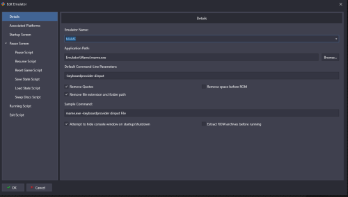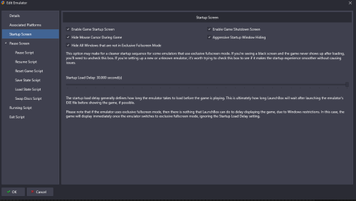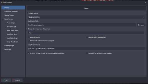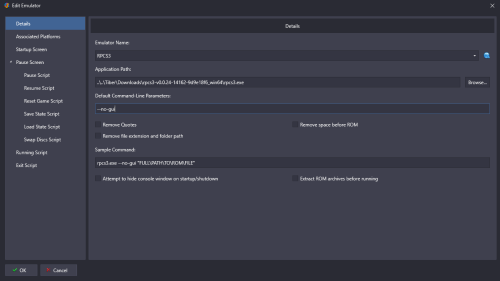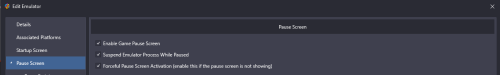 Both work here with Start-up and Pause I can replicate your issue by shortening the Startup Load Delay value to being too short - try putting it at full 30 seconds and see what happens and then shorten it from there if you need/want I am using LaunchBox 12.14 and Yuzu 1153 Try the following settings, and see what you get I think this works with Vulkan or OpenGL, but I know I have mine on OpenGL for some reason or other but I honestly cannot remember what it is - might have been a black screen issue Also do you have anything in your running AHK tab that might be affecting things? For PS3 Using latest RPCS3 - As downloaded to check it for you In emulator have in LaunchBox have and again try playing with the Delay time and increasing until it works? Pause screen is Let us know how it goes Cheers Ps There might be better/newer parameters, especially for PS3 emulator - I have stopped using it so this was just using the old info that used to work and giving it a quick try for you now