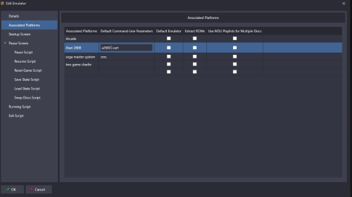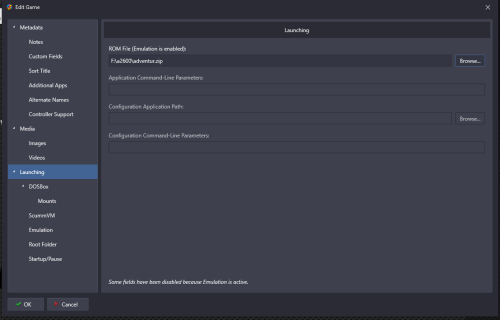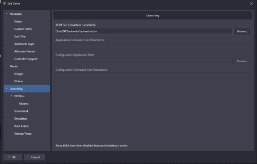 Ok I had had a little play and made some assumptions so hopefully this is ok and going to work Assumption 1 - you haven't set up the pathway to your atari roms inside your mame.ini file Version 1 - with the rom file being a bin file and not in a zip format as "expected" by Mame File Launching screen - as you can see its a bin file Emulator page - ignore it being called Trial emulator I use this for trialling things rather than it being a real one - important info DO NOT TICK ANY OF THE BOXES Associated platform page - have the skip game info and no window before cart The above works and loads the game. Below is how Mame emulator normally set up (for me) - its the ticks in remove file extension that I think cause the issue - when using below set up and the bin file it doesn't load - remove those ticks and it also works on my normal Mame setup whereas it didn't before Version 2 Assumption - using an Atari 2600 zipped rom set still zipped and having set your pathway to your Atari roms in mame ini eg rompath roms;R:\a2600 Launching tab - notice file called adventur.zip not adventure Emulator tab - boxes are ticked on this occasion Associated tab Both of the above loaded the game for me on Mame - I normally use the Stella Core in RetroArch for Atari and I have to say only just started with Atari stuff myself So maybe look at your Emulator tab and see what have ticked - your could always make another emulator called Mame-Console and still point to same Mame.exe but use use different set up on tick boxes Hopefully this comes across as helpful and not patronising PS - Retro808 and JoeViking245 know what they are talking about - just ignore me