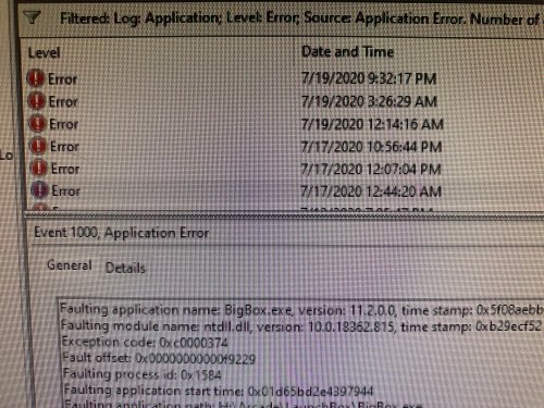 Just got a crash after 10 hours or so on latest 11.5 beta... Faulting application name: BigBox.exe, version: 11.5.0.4, time stamp: 0x5ee99cfc Faulting module name: ntdll.dll, version: 10.0.18362.1049, time stamp: 0xb5beef21 Exception code: 0xc0000374 Fault offset: 0x00000000000f9229 Faulting process id: 0x2640 Faulting application start time: 0x01d687b41bd94788 Faulting application path: H:\Arcade\LaunchBox\Core\BigBox.exe Faulting module path: C:\WINDOWS\SYSTEM32\ntdll.dll Report Id: 3b148de2-ce76-4ee5-ab21-6d9b06637697 Faulting package full name: Faulting package-relative application ID: I'm gonna setup an old v10 build to test... maybe even v9 (this may have started with v10) -
