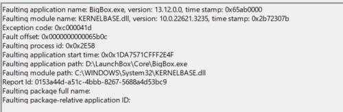After a boatload of troubleshooting, I am completely stumped and have to call in for support. BB crashes after an hour using a fresh install. All drivers are up to date. Windows 11 is up to date. I have uninstalled all legacy .Net distros and currently have version 8.03. After crash, it causes system instability. Event Viewer complains about not enough memory available after crash. Run -> MMC complains of vfile system error "-1073740791" Reboot remediates all of the issues until BB is run again. All emulators run fine, no issues there.