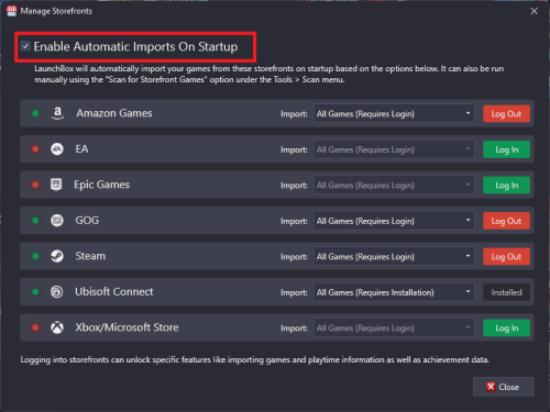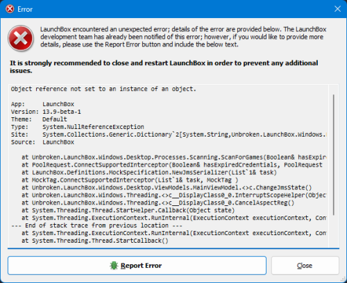 I've been getting this error when using the automatic storefront updates checkbox turned on, every time I launch LB since v13.8, and is still present in v13.9 beta 1. Object reference not set to an instance of an object. App: LaunchBox Version: 13.9-beta-1 Theme: Default Type: System.NullReferenceException Site: System.Collections.Generic.Dictionary`2[System.String,Unbroken.LaunchBox.Windows.Processes.AutoImportGame] ScanForGames(Boolean ByRef) Source: LaunchBox at Unbroken.LaunchBox.Windows.Desktop.Processes.Scanning.ScanForGames(Boolean& hasExpiredCredentials) at PoolRequest.ConnectSupportedInterceptor(Boolean& hasExpiredCredentials, PoolRequest ) at LaunchBox.Definitions.MockSpecification.NewJmsSerializer(List`1& task) at MockTag.ConnectSupportedInterceptor(List`1& task, MockTag ) at Unbroken.LaunchBox.Windows.Desktop.ViewModels.MainViewModel.<>c.ChangeJmsState() at Unbroken.LaunchBox.Windows.Threading.<>c__DisplayClass0_0.InterruptScopeHelper(Object ) at Unbroken.LaunchBox.Windows.Threading.<>c__DisplayClass0_0.CancelAspectReg() at System.Threading.Thread.StartHelper.Callback(Object state) at System.Threading.ExecutionContext.RunInternal(ExecutionContext executionContext, ContextCallback callback, Object state) --- End of stack trace from previous location --- at System.Threading.ExecutionContext.RunInternal(ExecutionContext executionContext, ContextCallback callback, Object state) at System.Threading.Thread.StartCallback() Recent Log: 9:15:34 AM Exception I've also reported the bug through the regular channels. Unchecking the box seems to prevent the error for now. Thanks, Rod
