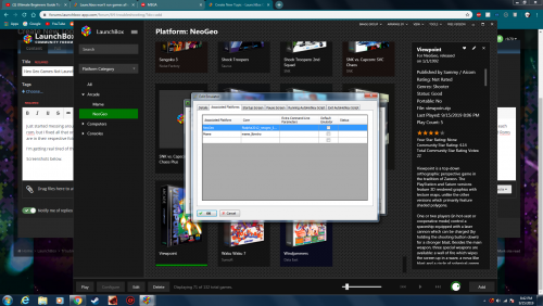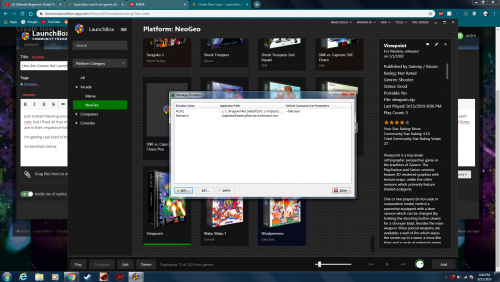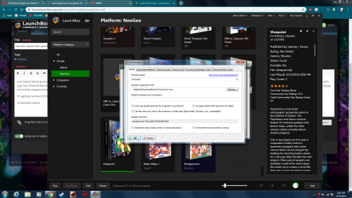 15. Just started messing around with Launchbox after waiting for so long. Impressed with all the work that goes into the app and my other games (Steam and PS2) run as expected. Then here comes Retroarch. First it was the Metadata not being associated with each rom, but I fixed all that one by one. After countless hours of experimentation, I still can't get Neo Geo games running worth jack. With Retroarch FBAlpha 2012 Neo Geo btw, cause that's the only one that runs in Retroarch for me other than MAME. Cores and Roms are in their respective folders as far as I know. Even reinstalled all the cores, and updated the info files and everything like the new Retroarch Tutorial on the LB YT channel. I'm getting real tired of this loop. Help would be tremendously appreciated. Screenshots below (Sorry for quality)