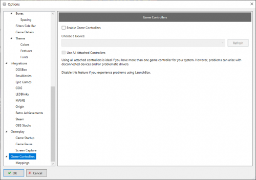 If you could go to LaunchBox options menu and go to the "Game Controllers" option page (see picture below). If those options are on (the "Use All Attached..." especially) but no controllers are plugged in I've seen the scan process mess with the cursor on some machines. Basically we ask Windows to give us a list of controllers and it does what SHOULD be a quick scan for us and then we update. I've seen that process cause issues for some users though and typically turning it off when not needed solves the issue.