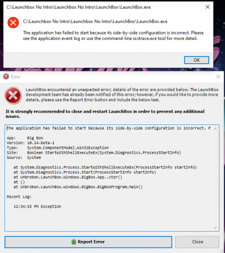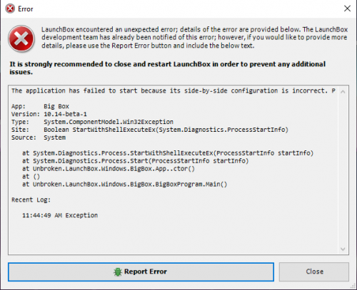 LaunchBox recently froze and it will open. I'm currently on Windows 10, completely updated. I've attached the actual error message. Thanks for any help!