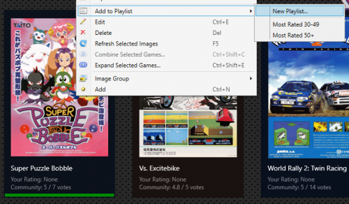 I've been trying to figure out which (Arcade) games to play but the MAME ROMset just has sooo many. Sure, Launchbox lets us filter and sort by Star Rating but this seemed a little problematic to me. Now, I'm sure that the *7* people that gave Super Puzzle Bobble a 5 felt it earned it but that's just not enough sentiment for me to thrust it into the best of the best games. So I decided I needed another metric to discover the best content. One that, despite the data being present in Launchbox, was not offered as either a filter or sort by option. Total Community Star Rating Votes. I figured if enough of you voted for a game, I should probably play it. So I created a Playlist. Well, 2 actually. Here's how. Caveats: It can be dangerous altering Launchbox's files This requires at least some familiarity with Python Do NOT run this when Launchbox is running You will need to edit the filename paths to match those on your system. There a five places in the code You will need to create each of the Playlists in Launchbox first to get the PlaylistId (from the Playlist XML file), then replace the PlaylistId's in the code If you decide to use a different Playlist name, change that in the code, too Code description: Read in Arcade.xml and get the list of all Arcade games Open the first XML file (Most Rated 30-49.xml) and write the XML header and Playlist definition Loop through the list of Arcade games with between 30 and 49 votes, saving each to the XML Write the closing XML tag Open the second XML file (Most Rated 50+.xml) and write the XML header and Playlist definition Loop through the list of Arcade games with 50 or more votes, saving each to the XML Write the closing XML tag from bs4 import BeautifulSoup as soup filename = 'C:\Emulators\LaunchBox\Data\Platforms\Arcade.xml' f = open(filename, encoding='UTF-8') xml_soup = soup(f, 'xml') games = xml_soup.findAll('Game', {}) filename = 'C:\\Emulators\\LaunchBox\\Data\\Playlists\\Most Rated 30-49.xml' f = open(filename, 'w') f.truncate() header = '''<?xml version="1.0" standalone="yes"?> <LaunchBox> <Playlist> <PlaylistId>876c8f1c-1e01-4966-90b6-63d7a87a9a27</PlaylistId> <Name>Most Rated 30-49</Name> <NestedName>Most Rated 30-49</NestedName> <SortBy>Default</SortBy> <Notes /> <VideoPath /> <IncludeWithPlatforms>true</IncludeWithPlatforms> <AutoPopulate>false</AutoPopulate> <SortTitle /> <IsAutogenerated>false</IsAutogenerated> </Playlist> ''' f.write(header) man_order = 0 for game in games: if int(game.CommunityStarRatingTotalVotes.text) > 30 and int(game.CommunityStarRatingTotalVotes.text) < 49: g_id = str(game.ID.text) lb_id = str(game.DatabaseID.text) g_title = str(game.Title.text) g_title = g_title.replace('&', '&') if len(game.ApplicationPath.text) > 0: g_filename = str(game.ApplicationPath.text).replace('G:\\Games\\mame\\roms\\','') g_platform = str(game.Platform.text) xml_string = " <PlaylistGame>\n <GameId>" + g_id + "</GameId>\n <LaunchBoxDbId>" + lb_id + "</LaunchBoxDbId>\n <GameTitle>" + g_title + "</GameTitle>\n <GameFileName>" + g_filename + "</GameFileName>\n <GamePlatform>" + g_platform + "</GamePlatform>\n <ManualOrder>" + str(man_order) + "</ManualOrder>\n </PlaylistGame>\n" f.write(xml_string) man_order += 1 f.write("</LaunchBox>") filename = 'C:\\Emulators\\LaunchBox\\Data\\Playlists\\Most Rated 50+.xml' f = open(filename, 'w') f.truncate() header = '''<?xml version="1.0" standalone="yes"?> <LaunchBox> <Playlist> <PlaylistId>b5cc4b9c-09df-4409-9786-a1c44f43a318</PlaylistId> <Name>Most Rated 50+</Name> <NestedName>Most Rated 50+</NestedName> <SortBy>Default</SortBy> <Notes /> <VideoPath /> <IncludeWithPlatforms>true</IncludeWithPlatforms> <AutoPopulate>false</AutoPopulate> <SortTitle /> <IsAutogenerated>false</IsAutogenerated> </Playlist> ''' f.write(header) man_order = 0 for game in games: if int(game.CommunityStarRatingTotalVotes.text) > 50: g_id = str(game.ID.text) lb_id = str(game.DatabaseID.text) g_title = str(game.Title.text) g_title = g_title.replace('&', '&') if len(game.ApplicationPath.text) > 0: g_filename = str(game.ApplicationPath.text).replace('G:\\Games\\mame\\roms\\','') g_platform = str(game.Platform.text) xml_string = " <PlaylistGame>\n <GameId>" + g_id + "</GameId>\n <LaunchBoxDbId>" + lb_id + "</LaunchBoxDbId>\n <GameTitle>" + g_title + "</GameTitle>\n <GameFileName>" + g_filename + "</GameFileName>\n <GamePlatform>" + g_platform + "</GamePlatform>\n <ManualOrder>" + str(man_order) + "</ManualOrder>\n </PlaylistGame>\n" f.write(xml_string) man_order += 1 f.write("</LaunchBox>") Tips Python is indent sensitive. I can't guarantee that the forum won't munge the indentation (although it looks okay after posting). Multiple line strings in Python are denoted by triple quotes. That's how the header variable is defined. I use a Jupyter Notebook to run this code. This is part of Anaconda (https://www.anaconda.com/distribution/) and is a fairly easy way to get started with Python. I'd link a tutorial but I've learned how to use it on a paid site. When I initially created the Playlists I did it by adding a single game to the Playlist and entering only the Unique Name and Nested Name. What have I forgotten?