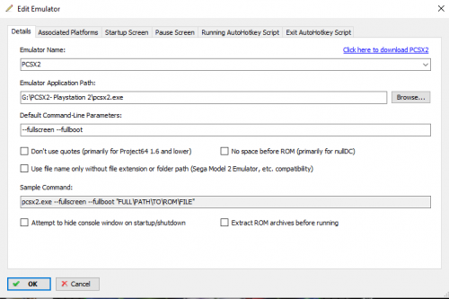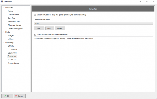Certain games require that Pcsx2 go though the BIOS sequence to function properly (particularly where saved data is concerned). I found a couple threads on the Launchbox forums that indicated the problem could be solved by putting --fullboot in command line parameters. Problem is, it isn't doing anything. No command line I enter into launchbox does anything (at least in relation to pcsx2). Anybody have any idea what is going on and how to fix it? EDIT: Issue is resolved, it was related to the custom command line parameters instituted by the plugin PCSX2 Configurator. Issue resolution makes PCSX2 configurator perfectly functional, I highly recommend it. The issue is caused by games using individual command line parameters after installing config files with the plugin (necessary to save individual graphics settings). You can alleviate the issue by erasing the config file or altering the individual parameter to include a desired command. PCSX2 Configurator will keep your platform commands when creating individual command line parameters, so as long as you create/download the configuration file after editing the parameter under emulators everything will work as expected. For example, if you have --fullscreen and --fullboot in your emulators command line parameters, as shown here: Then they will be included when you create/download a config file with configurator, as shown here: You can find PCSX2 configurator here: