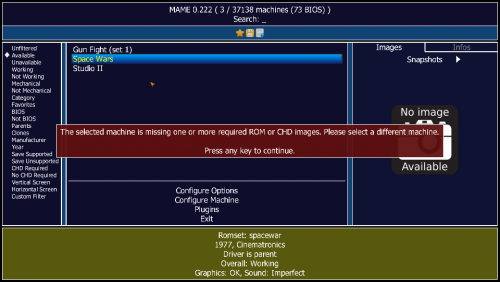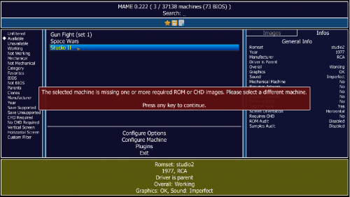 I have the studio2.zip and current MAME. I also just created an ini file which I didn't have earlier and even went into MAME64 and redirected my roms to the RCA Studio II folder. I'll add other roms later, but I just wanna focus on one platform to make it easier. What I'm not sure about is the "correct Software List roms" you speak of. Do you mean complete romsets? Because this is not the case. If there's a complete romset with all of these 1970s and 1980s roms in working condition, just let me know. By the way, the current issue is when I launch Space Wars on LaunchBox I get MAME's "initializing" message for a split second and then nothing happens. Then when I launch MAME64 and double-click it there, I get the message below. It's my understanding that BIOS need to be in the same folder as the roms and with their exact names. My Studio II folder clearly shows I've got everything where it should be. I'm even more confused by MAME's list of "available" machines even though every game has been renamed to match the "software name" listed on MAME's studio2.xml file.