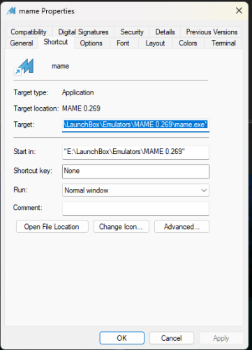 I am trying to setup launchbox on a separate drive from my main computer, and am having an issue with launching MAME. I currently have launchbox setup with MAME and Retroarch to run Arcade, SNES, Dreamcast, Gameboy Advance, and N64 ROMS. My main system is on my "C:" drive and my emulators and roms (as well as launchbox itself) are all on my "E:" drive. In the Launchbox directory, I have my Emulators in a sub-directory "Emulators" (MAME and RetroArch in their own respective directories) and all game ROMs imported and copied into the "games" directory, then into their specific sub-directories. Retroarch works perfectly for all system ROMs for which it is configured (all but Arcade), but MAME will not run and pops up an error window with an elevation error: "An error occurred while trying to launch the game: An error occurred trying to start process 'E:\LaunchBox\Emulators\Mame0269\mame.exe' with working directory 'E:\LaunchBox\Emulators\Mame0269'. The requested operation requires elevation.". However, when I run MAME itself outside of Launchbox, it runs fine and launches the roms with no issues. I have already set MAME to run as administrator, but that did not help. I also configured the launchbox directory to allow "Everyone" to have full permissions, but that didn't fix it either. Here is my MAME (0.269) launchbox settings. Any suggestions for how to fix this?