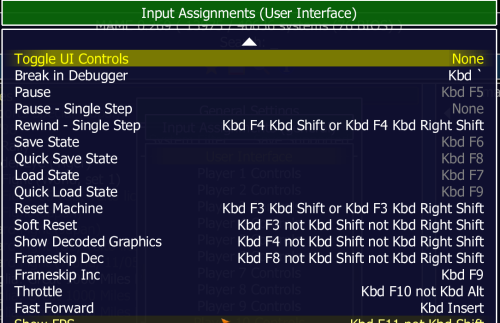 Hi, Thanks so much for the continued support. I only have 1 copy of MAME, but it is on a different hard drive from the main system files, and is in fact located in the Launchbox Directory under the folder "emulators" (not sure if that matters). I also confirmed that there is only 1 MAME emulator showing in Launchbox: When I press F6, I see this: And when I press "1" on the keyboard (top row, not number pad), I get this: When I press "a", I see this: Input assignments (general) seems to show the correct assignments: -