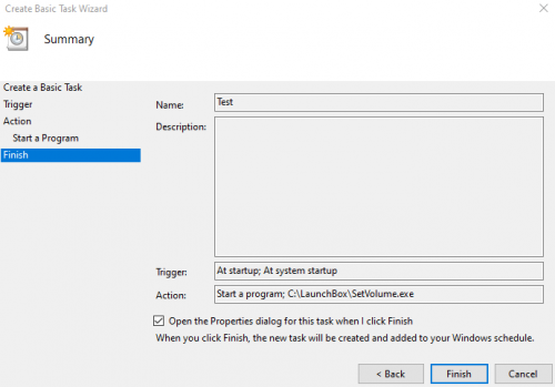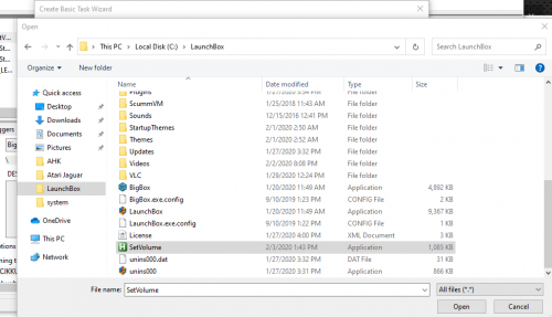 1. Hi, I just got LaunchBox, BigBox setup and went the same route for my Arcade Cabinet (change the shell to BigBox). Ran into the same volume control thing and was just about to give up as well. After digging around, I found that the Controller Automations in BigBox call the explorer dependent APIs for volume control. "Volume_Up", "Volume_Down", "Volume_Mute". You get that nice Volume OSD which indicates the volume level. These are made possible by the Windows Shell Experience which is part of the explorer shell. But since we're not launching explorer, this doesn't work at all. However, since all the other required Audio services (AudioSrv) are automatically launched by windows, its just a matter of scripting at this point. My workaround was to first roll my own AHK script that polls a "Hotkey" and the Joystick XY axes and sends the correct API call. One of the things I looked at while Googling, was to run the AutoHotKey executable as a service. You can't run the executable directly as a service, but you could use a commercial program "AlwaysUp" https://www.coretechnologies.com/products/AlwaysUp/Apps/RunAutoHotkeyAsAWindowsService.html I tried it. It works. But it costs $49 for a 1 user license. You get a 30 day trial, but I didn't think I needed all the bells and whistles just for some volume control. Someone might have interest in it, but it was a bit much for my purposes. Which led me to Windows Task Scheduler (already comes with Windows 10). Here is my AHK script (probably could be better, but it works). You can either launch it with AutoHotKey.exe or if you have AutoHotKey installed, just compile it and run it standalone. #Persistent ; Keep this script running until the user explicitly exits it. SetTimer, WatchAxis, 5 return WatchAxis: JoyX := GetKeyState("JoyX") ; Get position of X axis. JoyY := GetKeyState("JoyY") ; Get position of Y axis. JoyHoldDownPrev := JoyHoldDown ; Prev now holds the key that was down before (if any). if (JoyY > 70 and GetKeyState("Joy10") ) { JoyHoldDown := "Down" SoundSet -1 ; Decrease master volume by 1% } else if (JoyY < 30 and GetKeyState("Joy10") ) { JoyHoldDown := "Up" SoundSet +1 ; Increase master volume by 1% } else if (JoyX < 30 and GetKeyState("Joy10") ) { JoyHoldDown := "Left" if (JoyHoldDown = JoyHoldDownPrev) ; The correct Left Joystick is already down (or no key is needed). return ; Do nothing. ; Otherwise, the left stick was previously released SoundSet, +1, , mute ; Toggle the master mute (set it to the opposite state) SoundGet, master_mute, , mute SplashTextOn, , , Master Mute is currently %master_mute%. sleep 2000 SplashTextOff } else JoyHoldDown := "" return Then tell Task Scheduler to run it when anyone logs on. WindowsKey + r ; taskschd.msc Create a Basic Task (Right Pane). Give it a name On the next screen, select when computer starts or log on. We have to modify it later so either one works for now Select "Start a Program" On the next screen, simply browse for you executeable Hit next, and be sure to check the checkbox at the bottom before hiting finish In the next dialog, go over to the "Triggers" tab and click edit at the bottom In the "Begin Task" dropdown, change it to "At Log on". Set the radio button to "Any User" or to a Specifc User if you'd like. Then hit ok. Go over to the "Settings" tab, and uncheck the "Stop the task if it runs longer than..." checkbox. Hit okay, and you should see your new scheduled task in the top pane. Reboot into your BigBox shell and thats it. Volume control.