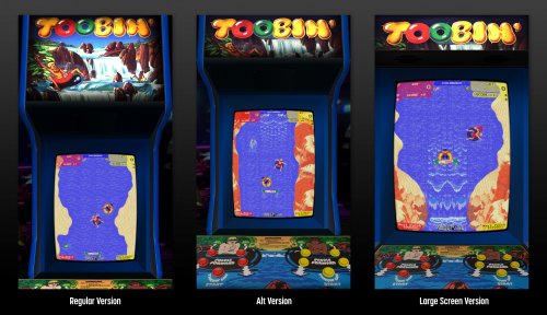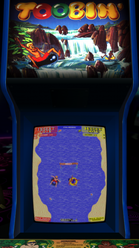 Toobin' One of Atari's quirkier cabinets of the 80s, Toobin' featured both an unusual all-button control scheme and a weird stretched cabinet design that evoked the laid-back aesthetic of surfing, tubing and the endless summer. Toobin' also has unusually high-res graphics for its era, which shows off its beautiful waves and waterfalls. It plays best on MAME with a 6-button Street Fighter-esque layout, where you can use the outer buttons for paddling and the bottom center button for throwing cans. The biggest challenge with this one was capturing its unusual cabinet shape while still making the game playable – I took some liberties with the actual construction of the cabinet, but I think I pulled off something that feels like the original cabinet. In order to best display all of the game's art and still make the game playable, I included several versions, which you can see below: The Medium version (left) features the entire header in all its gnarly glory but crops off the control panel, while the Medium Alt version shifts up to show off the control panel with a more compact header. I also included two larger versions which focus on the game and leave the cabinet design behind – you decide which is most fun to you. Toobin.zip
