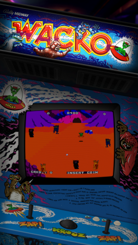Wacko A preview of my upcoming Bally/Midway Attack Pack! Wacko is legendary for its ingeniously stupid cabinet design, which tilted the marquee and control panel at an odd angle and perfectly captured the mentality of the game. The control scheme is odd, but the game isn't especially difficult, at least for the first few levels. Wacko works best with a trackball and joystick combo, but it also works fine with two 8-way joysticks, and you could even rig it to work with buttons for shooting if you have enough of them. Not the most memorable game ever made, but certainly one of the most original cabinets ever. Includes a larger screen version and a straight screen version for BYOB (bring your own bezel) shader enthusiasts. Wacko.zip