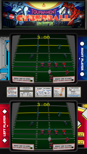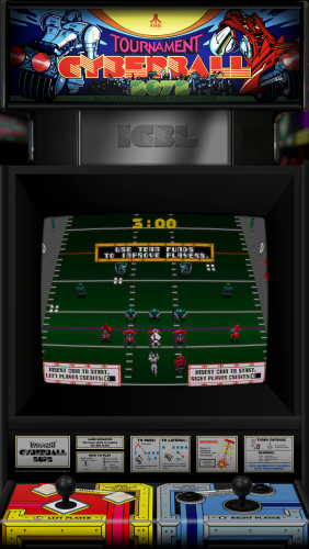 Cyberball 2072 Cyberball was a clever way to make football a bit more appealing to arcade nerds – by adding robots and an exploding football. The original Cyberball cabinet featured two screens, allowing head-to-head team play that was unusual for its time. The sequel, Cyberball 2072, added new game modes and a lot more plays, and included both a two-player cabinet and a four-player Tournament Cyberball 2072 version. My design for this overlay is a bit of a hybrid, combining the big header style of the two-screen Tournament Cyberball 2072 cabinet (I replaced the mirror with a metal plate stamped with ICBL - International Cyberball League) but shrinking it to fit on top of one half of the same cabinet. Provided you have the right files, you can play any variant of Cyberball with this overlay – the single-player screen will appear where it should, and the second screen will just be invisible. You will need to be able to access all the game's clones if you want to choose which version to play, and you may need to set your controls accordingly. I also included a somewhat weird but certainly playable head-to-head overlay, seen above. Yes, this means if you want to play head to head, the second team will have to look up to see their screen, which is not ideal but also not really avoidable on a vertical screen. It does work, however! Please refer to the included instructions for more info. Cyberball 2072.zip