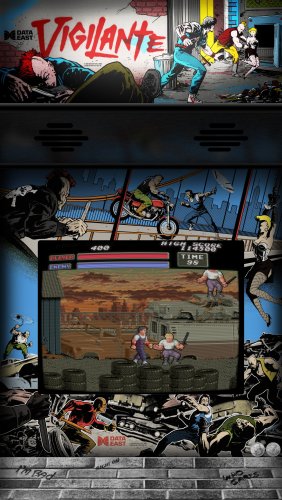 Vigilante Back to more conventional cabinet ground, Vigilante is my replacement entry to round out what I'm now calling my Run n' Gun n' Hack n' Slash Pack, as I'm moving Xenophobe to the upcoming Bally/Midway pack. Vigilante came out in 1988 with somewhat dated gameplay (a beat-em-up in which you can only move left and right), but its colorful graphics and amazing 80s synth score made up for it somewhat (plus the thud of the punch sounds is quite satisfying). There is very little strategy to Vigilante, just timing, and as you will see from a variety of YouTube videos, once you get the nunchucks you will basically beat the game. Nonetheless, it was a classic of my youth, and thus worth recreating. Includes a larger version if you really want to show off those pixels. Vigilante.zip