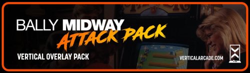I'm baaaack, with a huge new vertical overlay pack, AND a new website! Check out verticalarcade.com to find all my overlays, along with links to other overlay creators and info on buying your own vertical cabinet. My latest pack is the Bally Midway Attack Pack, a set of 12 new overlays (including two already in this thread, Wacko and Xenophobe) featuring some of the best games released by one of the great American arcade manufacturers of the '80s. I'm including all of the overlays here as well, but this current set does not include instructions or preset info as on my other downloads, as that information is now on the website. As such, these downloads are now simply the overlays, so you can drop the Zips from this pack directly into your MAME artwork folder. As noted in previous posts (but you might have missed it), these overlays include multiple presets, accessible from the MAME Tab menu under Video Options. The Curved presets are designed to work with curvature shaders – if you don't have a curvature shader, or it doesn't look right with the shaders you have, choose the Straight presets instead. Check out the site for preset info for specific games. Keep scrolling to find the games themselves, or download the entire pack at the link above. Have fun!