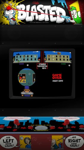 Blasted This somewhat experimental, not-quite-a-gun game started out as a four-player shooter called International Team Laser, but switched directions to this two-player version instead. Blasted pits one or two military snipers against evil cyborgs intent on wreaking havoc in... an apartment building, for some reason. It is not a gun game, but instead uses a joystick that moves a targeting reticle, providing both a zoomed-in sniper view and a wider view to take out your enemies. You must shoot the glowing red sweet spot on the various cyborgs, with a particular emphasis on the floating "cybornetic balls," before they can shoot back. The original cabinet used gun-shaped joysticks, which are reproduced in some of the presets, if you're into that sort of thing. blasted.zip