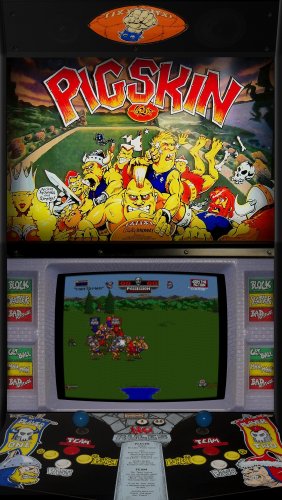 Pigskin 621 A.D. Taking a page from Cyberball's "football but robots" playbook, Pigskin 621 A.D. is "football but actual Vikings and other medieval and sometimes fantasy characters, but also sort of rugby." Appearing with the tagline "Ancient Archrivals on a Rampage" (because the game's designers worked on both Arch Rivals and Rampage), Pigskin litters the field with hazards like pits, pools and logs, and encourages beating up the other team at every opportunity. Control can be difficult at times given that the game follows the ball (so your character is regularly offscreen and can be hard to find), but the game offers an amusing take on a familiar sport. The original cabinet featured light-up indicators of your team's current strategy, which are sadly non-functional in my version (perhaps I will get them working at some point as I know it's possible), but the same information appears on-screen. pigskin.zip