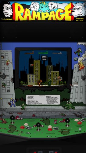 Rampage It may have mutated into a questionable Dwayne Johnson movie, but Rampage started as an '80s arcade hit, centered around three erstwhile scientists who tear their way across the country after transforming into giant monsters. Players choose a character and then must destroy all the buildings on a level to advance, eating people and other food for health and avoiding attacking helicopters and soldiers. Like the arcade version, the MAME version ties the character to the controls, so you may need to edit the controls in the Tab menu to get the character you want. Rampage's pixelated cityscapes, tiny denizens, expressive creatures and addictive gameplay make it a classic worth playing today. This overlay includes multiple screen sizes – the preset shown above is most faithful to the original cabinet, but you can enlarge the screen to suit your taste. rampage.zip