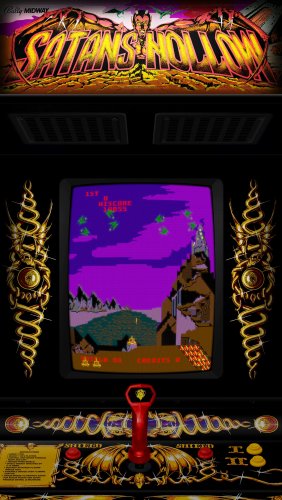 Satan's Hollow One of the first games released under the Bally Midway label, Satan's Hollow centered around the somewhat edgy (for the '80s) concept of fighting Satan's minions in "the Hollow" (because hell was presumably one step too far). The gameplay is reminiscent of Galaga, with the addition of a shield and the ability to drag segments across the playfield to build a bridge over a lava pit, which enables you to fight Satan himself (who is actually not terribly impressive). The original cabinet featured a translucent red flight stick that glowed next to the black light embedded in the front of the control panel. shollow.zip