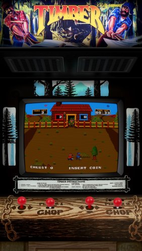 Timber Timber takes the working-man ethos of Tapper into the woods, where two burly, enflanneled woodsmen compete to chop down the most trees within a time limit. In addition to trying to crush your opponent with falling trees, you must avoid beehive-throwing bears and catch newly homeless birds for bonus points. Timber was designed by Steve Meyer, who also designed Tapper, and like that game it features a minigame every couple of levels, this time a log-rolling challenge that is a fair bit tougher than the beer-shaking game of its predecessor. timber.zip