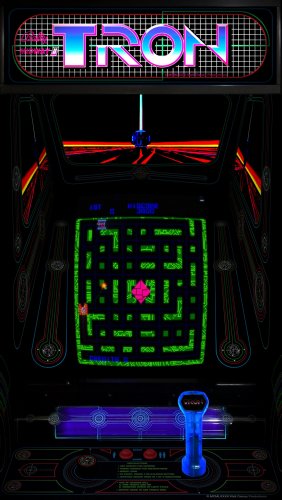 Tron Still a beloved classic from the early '80s, Tron adapted the concepts and overall vibe of the Disney movie to create a memorable set of minigames. The music and sound effects still evoke an '80s arcade almost as much as Pac-Man and Donkey Kong. Tron also featured a distinctive cabinet design, with a deep interior that made you feel like you were being sucked into the game world, and a black light-enhanced glowing flight stick. My version of the cabinet is somewhat stylized, taking some liberties with the actual design in order to represent the feel while optimizing playability. To play it on MAME, you'll need a one-button flight stick or joystick as well as a spinner (thanks to a resurgence in interest, you can now get a decent reproduction of the flight stick, and there are several spinners available). (Note that the forum is compressing the JPEG even more, so it may look very dark – click on the image to see it in more detail.) tron.zip