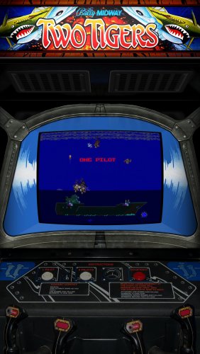 Two Tigers Take to the skies and slowly sink the enemy's ships with the flaming wrecks of their planes, with or without a wingman, in this challenging shooting game. The mechanics of Two Tigers take some practice, as you must shoot down enemy planes or drop bombs in the same spot several times in order to punch enough holes in the ship to sink it, before the ship sails off for calmer waters. Fortunately your lives are unlimited (you lose after two ships escape) and the enemy planes mostly don't notice you're there (though you can be killed by enemy fire and some planes). The game includes a dogfight mode in which the players take turns trying to shoot each other down. Note that there are three buttons – shoot, speed (accelerate) and bomb. twotiger.zip