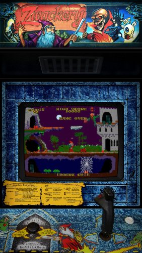 Zwackery Zwackery was an oddity in mid-80s arcades, combining excellent and expressive graphics with surprisingly complex gameplay and controls. Players step into the robes of Zachary Thwacker, a wizard on a quest to save a lovely princess who has been turned into a frog. Along the way you'll encounter crows who love to drop things on your head (and then turn into flying eyeballs), aggressive mushrooms, gargoyles, guards, devils, skeletons and ultimately a dragon, all while trying to defeat the Evil Ghoulum. Zwackery requires near-ambidexterity to master, as you control the wizard with a flight stick with two buttons corresponding to your sword and shield, rotate your sword/shield arm with a spinner, push the spinner down to pick up items and pull it up to cast spells. I included this game because it's a cult classic, but it is very difficult to play on MAME without a two-button flight stick and a push-pull spinner (controller users will likely fare better). If you can find a way to play it, it's something special. zwackery.zip