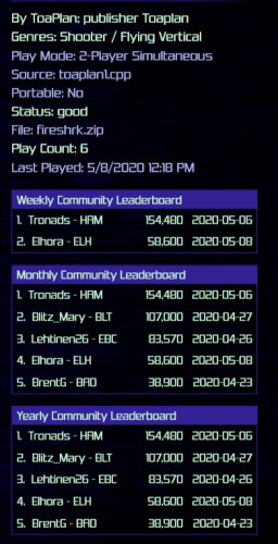 7. Here is a new log. On the same Launchbox session, columns 2 has its hi score updated, while for Fire Shark, played right after, hiscore just didn't update in Launchbox. Debug 2020-05-06 09-26-05 PM.log