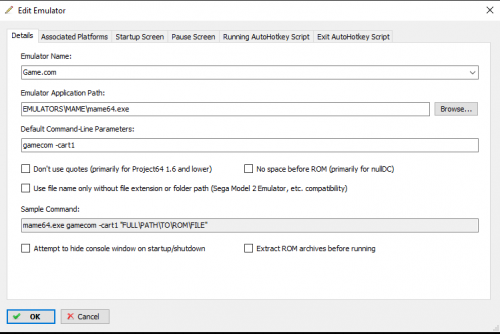 @ajhickin I just happened to stumble across this post while doing some research on AAE and saw your last post regarding the Tiger Game.com I have configured mine by adding a new emulator called game.com that points to the mame64 executable. To make it work, you have to add gamecom -cart1 to the default comand-line parameters so MAME knows that you are attempting to launch the given ROM using the gamecom machine MAME is programmed to emulate. When adding ROMS, just select your game.com rom directory as you would for any other system, select the game.com emulator, specify that you are importing Tiger Game.com games for the platform, and off you go. I added the Tiger Game.com in the Associated Platforms, as well. Maybe not the most elegant way to do it but I intend to do the same with the CD-i, Intellivision, and Vectrex when I get around to it. -