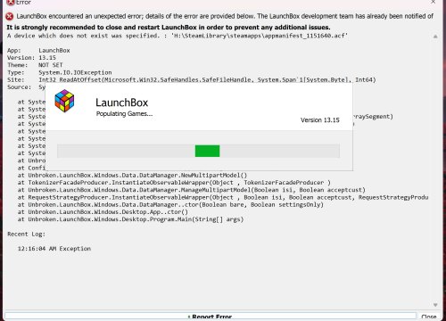So I am getting this error upon trying to start launchbox. I presume its because something changed about a storage location but launchbox wont open, it just repeatedly throws the error and wont allow me to open launchbox. How do I fix it?