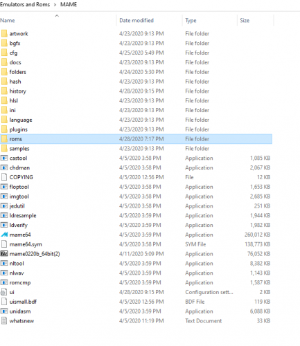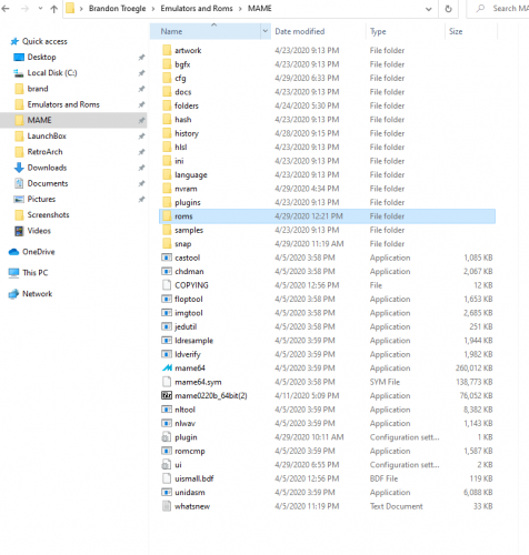 Hey all, and thanks in advance for suggestions/help. I just built first cab and am setting things up but am struggling to get the arcade games on MAME working. I've set up the arcade, NES, and SNES games through LB, and spot-checking several NES and SNES games that I’m running through Launchbox with retroarch - those seem to work. The MAME arcade games I’m struggling with and don’t know why. Some work, some don't. It’s something in MAME as running through MAME instead of LB the same games that don’t work in LB don’t work in MAME. As a brief history of the setup, I originally download the .220 Rom set (non-merged) right as it was made available a couple weeks ago. When I started to test games, while a handful seemed to work (1941 played fine for example) many other games (most it seemed) did not load and after looking at my ROMS file I noticed many seemed to be missing. I don’t have a good explanation for this – for whatever reason an incomplete download (was about 14GB in total). So I started over a couple days ago – I deleted the original ROMs and re-downloaded ROMS (though I chose the .220 split this time). I see games I didn’t see before and obviously many more files than before. As a reference check that I have everything, the ROMs file is now 69GB with 37k files. I thought that would fix it. Still have a lot of games not working. I decided maybe something was missing in the MAME folder and I should just start over to make sure I had the right MAME files and redownloaded mame0220b_64bit.exe last night. That didn't seem to fix it either. So I'm stumped - why won't games like Commando and Defender play? The ROMS seem to be there (and should be after the download). Here is a look at the path showing what I think I should see for those - right? Playing through MAME it says the selected machine is missing one or more ROMS ot CHD files when i try to play Commando or Defender (these are just a couple of many that don't seem to work). Here is the MAME folder - is something missing? In case it helps – at top of MAME it says MAME .220 (36921/36921 machines (73 bios)) I've searched around on the forums and while I've seen people mentioned the same error message (missing ROMS) it seemed the issue usually pertained to mis-matched versions of the ROMS and MAME etc. I'm guessing I've missed a step - something I should have downloaded, something I was supposed to configure, etc, but can't figure out what it is. Any ideas? Thanks so much.