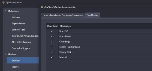 Go to any game edit -> edit metadata/media Delete the metadata Re-Download the metadata (at this point emumovies would find something of course) Change name in the platform field in the same window (for example "sony playstation 2" to "2000 - sony playstation 2") Go to Media -> Images -> Download Media and wait if emumovies finds something