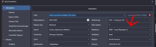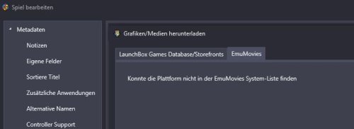 I did some random test with "Sega Rally 2" on my "1998 - Sega Dreamcast (PAL)"-platform and EmuMovies found something. Then I tried to reproduce the issue. I chose a game on my "2000 - Sony Playstation 2"-platform, which was lacking metadata. I downloaded the meta data and it changed the platform in the game-info to the standard name "sony playstation 2". Then I changed that in to "2000 - sony playstation 2" and pressed ok. Then I tried to download from emumovies and the error pops up (it's saying PLATFORM, it's not saying "Couldn't find something for this particular game" - maybe it's just the wrong error message and EmuMovies means the game...). I took a screenshot of everything I did. I really hope you can reproduce it now. Thanks alot for looking into it. EDIT: Did some more testing and wanted to know, if EmuMovies finds something right after (re-)downloading the metadata and BEFORE changing the platform name in the metadata windows manually - and it did! So changing the platform name right after downloading the metadata is the step, where it gets broken.