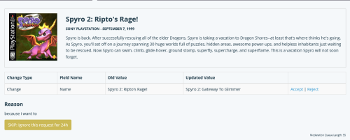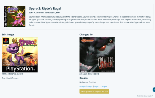 Someone keeps proposing that the box cover for Spyro 2: Ripto's Rage! for Sony Playstation be changed to a thumbnail of the cover for Creature Shock for Philips CD-i. I'm guessing this person is one of those trolls I've heard about? If so, can these be tracked? Do screenshots help, or what exactly do you need? In case it helps here, providing screenshot.