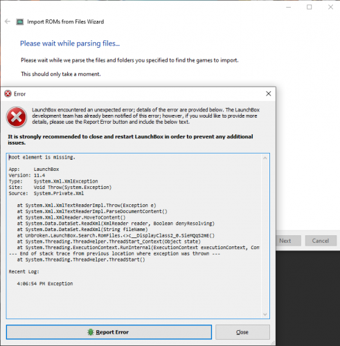 Any help would be appreciated here. I've tried restoring from several data backups but that doesn't seem to have fixed the issue. Launchbox seems to work fine, but when I try to import any ROMs I eventually get the following error when the import ROMs GUI makes it to the "Please wait while parsing files" page.