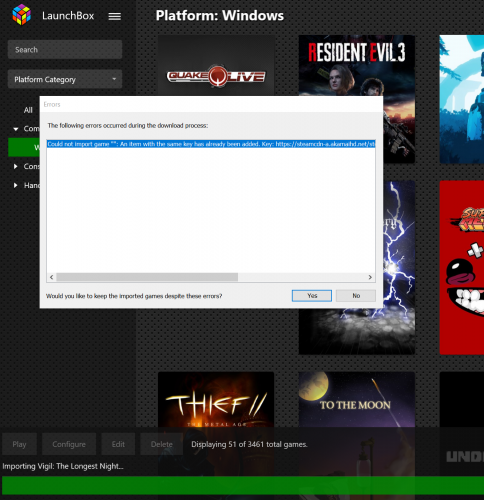 Trying to import a steam game I just installed. I went through the normal process "Tools > Import > Steam" and clicked through the wizard, making sure only my new game is selected. Then I get an error with the message "Could not import game '': An item with the same key has already been added. Key: <steam cdn url>". After clicking Yes, my game is not imported and it says "0 games imported". How can I get around this?