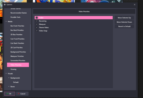 I think I know how to set them up, and I found the checkbox that enables them in Launchbox, but I'm confused on how "priority" is supposed to work, or maybe I'm confused as to what it means. When you set priority in the settings, I take that to mean that it will play say Trailers first, Video Snaps second, etc. But it only seems to play trailers.