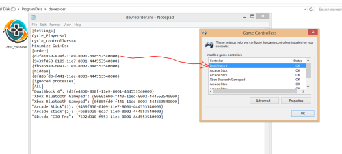 hi, the ahk is the source code. you right, i forgot to add it, i added it now, download again. joytokey is retaining order by GUID just like devreorder, that's true! but you have to map all the buttons to keyboard keys. that's how i used to do it before i found devreorder, but it's not a good way, for example keyboard games, or pc games can have conflict with your mapping, so you have to adjust for that. anyway, that's not the problem my script is trying to fix, if all you want is a fixed order of 4 controllers, you just put thier GUID under [order] section (in the order you want) and you are done: that is the fundamental function of devreorder. you don't have to run Ctrlr_Cyclr.exe. what i have done is made you a graphical menu that let's you switch between controllers in case you feel like trying a console game that has analog inputs or something like that... that's why you also have a cycle players (8) button, so you can assign a controller for every player. if you only assign a controller to player 1 you leave the rest of the controllers to the mercy of the gods of windows..