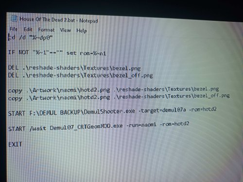 Thanks so much again for your patience and your kind replies. Your input definitely helped me. In the end I had to play around with the syntax a bit and try out things and actually found out that I didn't even need the DEMULshooter line in the .bat file of each separate game because that was what actually caused an unnecessary CMD window to pop up, and leaving out the /wait command also helped! Once you've set up the DEMULshooter (in the GUI file of it) it seems to be running and working. Some lightgun games are running quite smoothly now (SS USA, HOTD, HOTD2, VC2) but now I have encountered another problem having to do with calibration in EXTREME HUNTING 1 and 2 but this I will ask in another thread. Thank you again for this great community! -