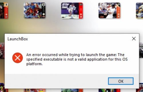 Hi there, recently made the switch from Hyperspin to this and loving how easy it's been to set up... But I can't get project64 to work in LaunchBox, I'm receiving the error: "An error occured while trying to launch the game: The specified executable is not a valid application for this OS platform" But this can't be right as I can run project64 fine outside of LaunchBox, and if I right click a game within LaunchBox, and select open Project64, the emulator opens up and I can play a game from the list within project 64 fine. I first installed LaunchBox to a different location but moved the folder to a different place and that includes all the emulators and ROMs, I did update all the paths for the ROMs and emulators. Others are running fine since. I'm hoping I'm missing something simple and obvious!! Thanks in advance.