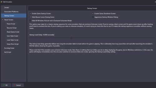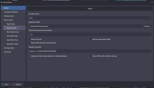 Yea, there isn't any special work arounds required either. if it's still giving you a hard time you would want to prove if it's emulator related or frontend related. do that by opening a CMD window and launching the game that way, using the same launch commands as LB/BB would. if it fails there then likely your launch commands aren't correct. -f switch is for launching in fullscreen and -g switch is defining the file (game) to run. so that sequence is important, the -g switch must come last due to the file path gets appended onto the end. edit: using emulator version "yuzu 1439" - I just had to set this emulator up again in the last week so it should be a pretty recent build I do use Startup and Shutdown Screens, still works OK with them enabled. Not sure if this is what you meant by "startup timer", maybe you meant the slider "Startup Load Delay"? And I use this in my running script to make sure it exits OK $Esc:: WinClose, ahk_exe {{{StartupEXE}}}