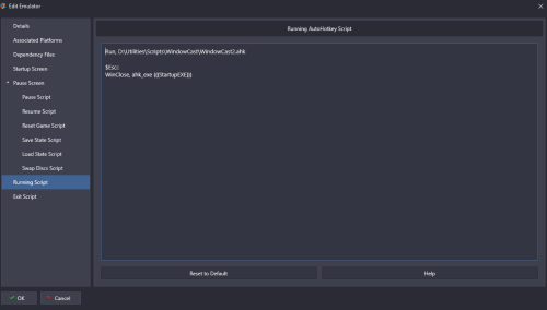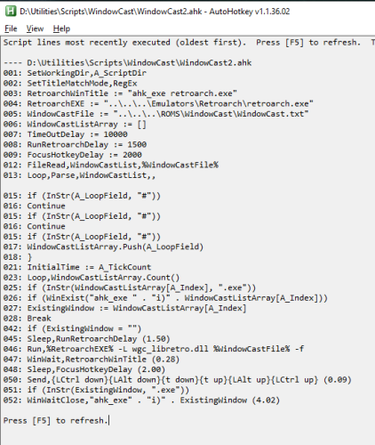 8. Damn, no red flags! That's formatted correctly. You didn't add anything? Did you get lucky and xemu was already in there? 😂 I could create same infinite loop by putting no lines that would need to be used to match to the emulator/game window. for ex.... Though there is text here, they have the intended comment marker that the WindowCast core uses, and my script is using them in the same fashion, skipping a line if that is found in said line. This results in nothing being pushed into an array, which I then use the qty of entries in that array to determine the qty of loops needed. So if it's 0 the infinite loop can happen. This is why I think your file isn't being read/parsed and/or pushed into the array. I can take your files, change the path of the two needed variables, that being Retroarch and WindowCast.txt and it works for me. So far, I think something specific is causing your system to not read/parse the file appropriately. It does explain why it works manually, but not through this script. I'm gonna need to make some special script for you in order to troubleshoot further. Still need to determine why it's going off the rails for only you. I've added a message box to display right at start to show the exact contents of the file being read. You should see a message box just like this, displaying the contents of the file as expected. If you do not, we at least will know this is where it is going off the rails. The rest of message boxes will be blank or nonsense if this first one isn't showing anything. If you see the expected file contents then I got more checks below If the file is being read properly, next message boxes are checking the contents are or are not getting pushed into the array. Checks line by line starting at top, based on contents of your WindowCast.txt file it should be a no, yes cycle. For ex Followed by It will then do the same for the PCSX2 and Xemu entries Once it makes it through the file it should display one more message box showing the qty of entries in the array, which is how many loops it runs in order to check each one of these lines for an existing window or process. Should be 3 entries based on your WindowCast.txt file Please try this version of the script to see how these message boxes behave. Let me know how it goes!