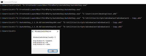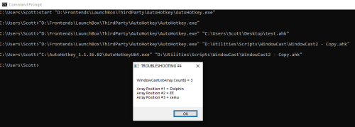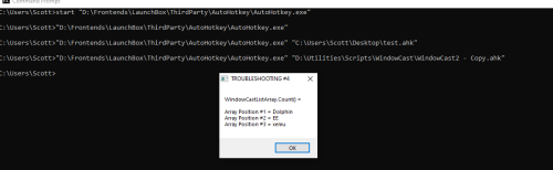 7. no problem and your welcome! but we're not quite out of the woods yet, hold the thanks until then......we will get there. I'm determined lol ok this is all excellent info but......not good.....I'm at a point of 'da fuck is going on here? 😕 it's reading the file (good), but does not seem to be pushing these values into the array (bad)......weird situation. I'm no programmer and don't understand what challenge is on your side, bare with me as we stumble through this together. Very frustrating since the script works for me, this specific issue isn't making sense why it would show up on one person's system but not another's. I'm adding some more stuff to try and troubleshoot. After the 3rd message box I've got #3B right after it. Right before this, the value is pushed into the array. So, by theory reading that array position right afterwards should let us see the exact same value. For ex If it's blank like this (notice no "Dolphin" or whatever value it was supposed to add to the array) there is some problem going on I cannot identify yet this will repeat for the PCSX2 and Xemu lines like last time The last message box will have more text. Even if the array count is null maybe something weird is going on with just the count function. This also reads the array's first three entries regardless. So we want to see stuff here for ex Please try this version of the script out AFTER trying the above version to see what happens....THEN please do this edit to the above script. Simply replace line #6 with this line below. All we're doing here is adding "Global" in front of declaring the array. Global WindowCastListArray := [] After making that edit try and run the script again and see if behavior changes! Fingers crossed! 🤞 For transparency. The first test is to see if the values in the array can be read prior to leaving the loop where they are being pushed into said array but still cannot be read outside the loop. The second test is to see if making the array a global variable will allow it to be read at all other points in the script