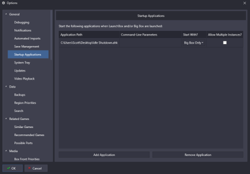 3. This can be handled with AHK. Shutdown if idle more than X. For ex, this uses 5 mins, adjust to your liking. Slip it into LaunchBox Startup Apps and set it to run only when Big Box launches Loop { If (A_TimeIdle >= 300000) Shutdown, 8 Process, Exist, BigBox.exe If (ErrorLevel = 0) ExitApp } FYI this was tested with attract mode running. Artificial inputs from Big Box have no impact on the built in AHK var A_TimeIdle and script works as intended Edit.....I re-read your comment and seems vague now lol. Did you mean to shutdown the PC or "shutdown" (close) Big Box and PC stays on?