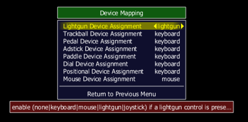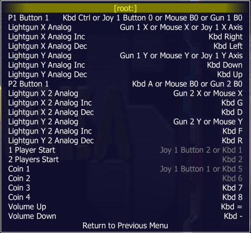first and foremost, you need to have done the controller and device mapping that was the subject of this thread, the stuff I shared in my previous post. this means you must have made a ctrlr file that properly maps your lightguns per their names/IDs that I recommend to call "lightgun_remap.cfg" and you need to have a game specific ini file (in this case Area51.ini) file that is calling to use the lightgun_remap for the ctrlr option. assuming you took care of that you need to setup Lightgun X Analog and Lightgun Y Analog per the specific game's config (looks like you're in the right spot) so the lightgun works. and looks like there is only one button, obviously the trigger, so you need to set that to P1 B1. THEN you should be able to start playing But I'm sure you messed up something earlier in the setup if no buttons register, or only some do in MAME. you can test the lightgun outside of MAME first. just pretend it is a mouse so check all those buttons work. You can use gamepad-tester.com to test the joypad buttons are working. once you verify the lightgun is working right as intended for Windows, then you know at least that is fine and the problem is your setup with MAME. In lightgun's software I use absolute mouse settings. My onscreen buttons are all mouse clicks, left, middle and right. My offscreen buttons are all joypad buttons 1, 2, 3 so you need to sort of think this out yourself how you want to set it up since you have two layers of configuration to align between the lightgun software and the emulator. this part is very customizable to the individual or game so experiment with what works for you once you get the hang of setup. I for ex normally setup stuff like the start and coin buttons to the offscreen buttons and I have holding down the offscreen 3 button for 5 secs to engage a calibration so I can do that easily without having to bust out a KB+M here is my setup. Mine is a bit of a catch all here since I have configured not just the lightgun, but also so the mouse, controller, or keyboard can all work....or actually this is how it is by default isn't it? WHITE text means it is the default, and the greyed out text is ones I have customized....so wtf yours should have worked fine out of the box with the standard defaults.....regardless you just need to actually set it up. If buttons or mouse isn't registering you likely didn't do the device mapping. (see the last photo below) Configure Options > Device Mapping