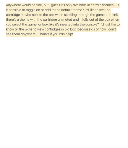 Can someone please tell me which themes support cartridge views in big box? I'd prefer 3d cartridges, but even the 2d cartridges I'd be happy with. Is it possible to view cartridges in the default theme? I can't find it anywhere in the settings. Thanks if you can help!